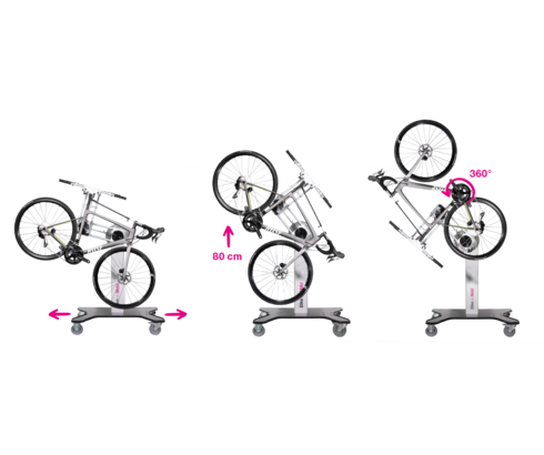 Bike proStand is a stationary, electrically operated assembly fixture for bicycles, cargo bikes and e-bikes weighing up to 40 kg. Without an electrical rotation axis it can accommodate up to 80 kg.is a stationary, electrically operated manipulator for handling and assembly of bicycles up to 40 kg weight.