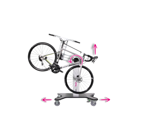 Bike proMobil is a mobile, manually operated assembly fixture for bicycles. The adjustable gas spring for load balancing allows bicycles weighing up to 40 kg to be positioned ergonomically.