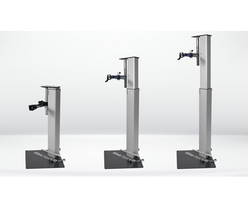Bike proStand is designed for stationary use in workshops and is supplied with a 230-V fixed connection. It consists of two electrically adjustable axes: height adjustment with a stroke of 1,470 mm and a rotary axis that can be rotated infinitely by 360° with a drive torque of 90 Nm. For stationary use, the assembly device can be screwed into the floor or attached to a base plate for stability. It is suitable for bicycles up to 40 kg. The version without a rotary axis can lift cargo bikes weighing up to 80 kg.