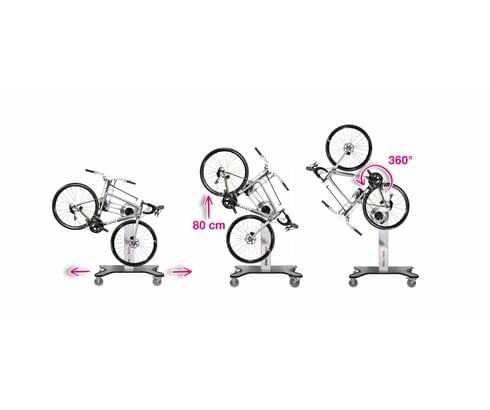 - Ergonomic working by picking up and setting down all types of bicycles due to 800 mm stroke with force compensation